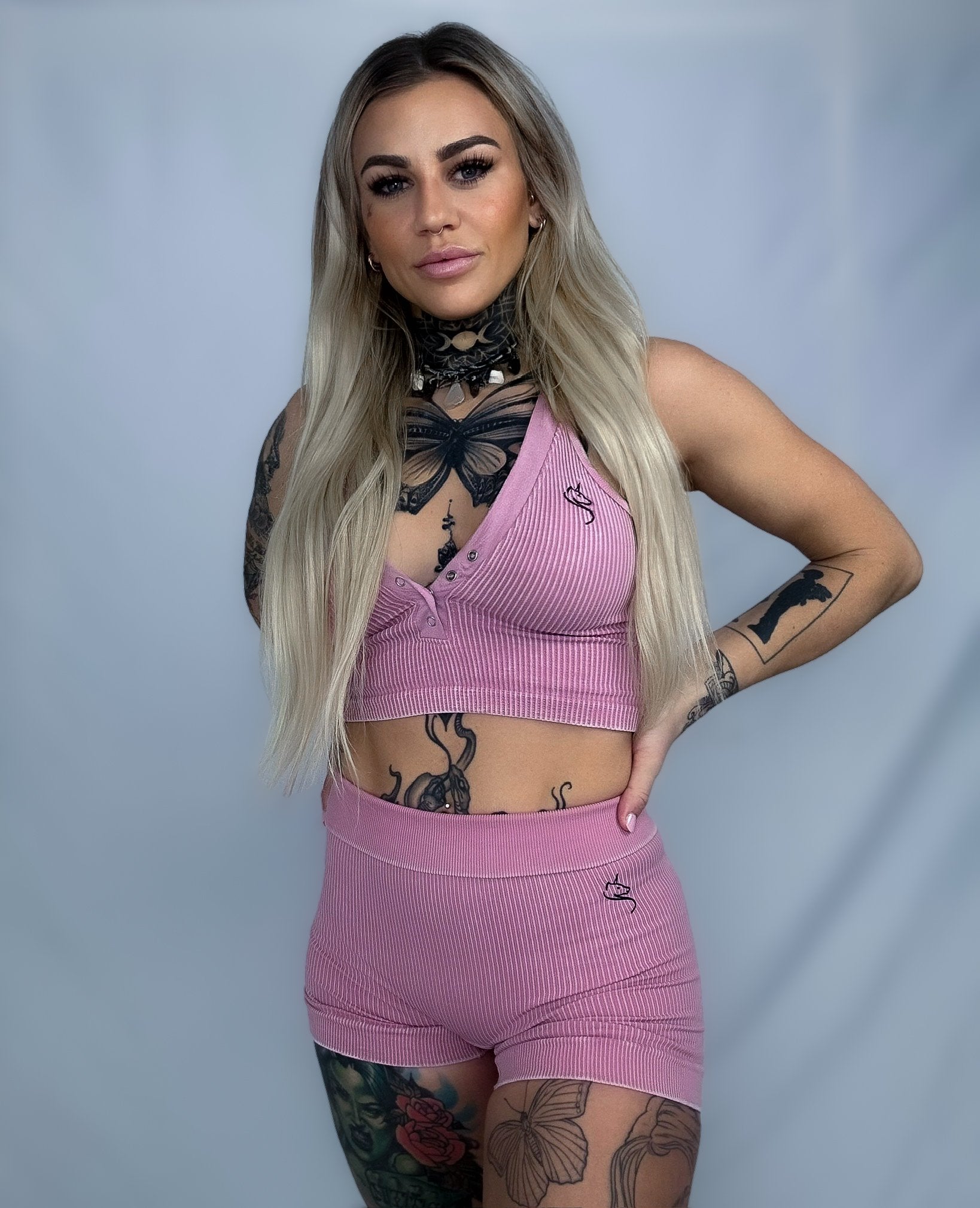 Introducing our Pretty in Pink Ribbed Set. The shorts feature a thick, quality ribbed material with a flattering scrunch butt accent. The shorts are designed to enhance your natural curves while providing optimal support. Pair it with the matching snap-button-down top. Perfect for both gym sessions and casual wear, this pretty in rose bud pink set lets you feel like the strong girlie pop you are.